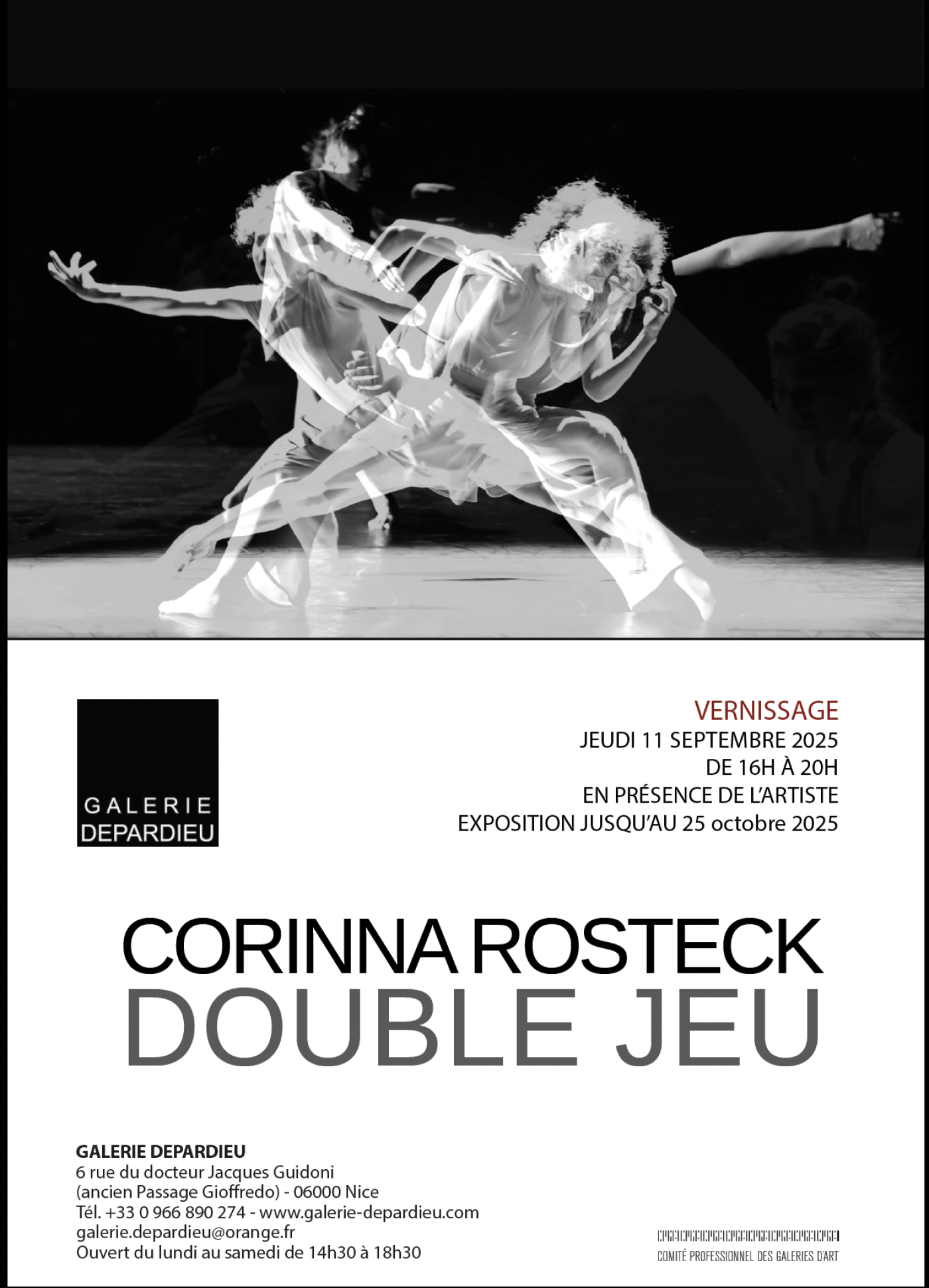 Corinna Rosteck presents at Galerie Christian Depardieu fascinating photographic works and videoart, which were created in cooperation with various international dance companies, performances and other creative partners. The artist works with multiple and double exposures. superimpositions capture the seemingly invisible, moments of transition on top of each other, creating incredible transparency and also irritation. Most of the photographic artwork have the character of a painting. Is this a dream? A feathery swirl of long hair. Seemingly melting, transparent fabric surrounds the dancer. Where is the face? The figure blurs in the movement, doubles itself.