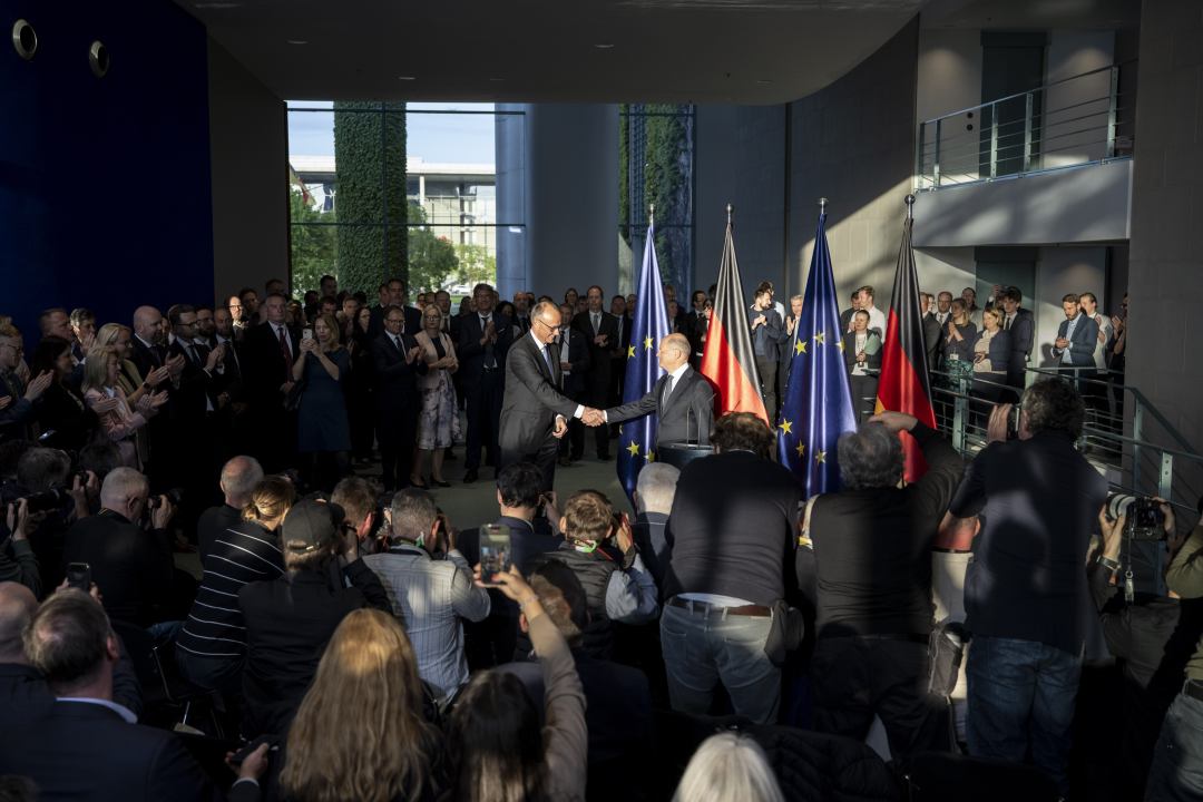 Der mit 7.000 € dotierte Preis für das beste politische Foto wurde an den Fotografen Marco Urban verliehen. Sein Foto der Amtsübergabe von Olaf Scholz an Friedrich Merz zeigt, so die Jury, wie Demokratie funktioniert.